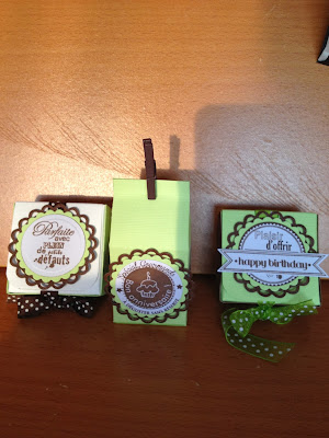Je vous présente aujourd'hui des petites boîtes réalisées pour les anniversaires de Stéphanie et de Christina. Elles sont remplies de chocolat.