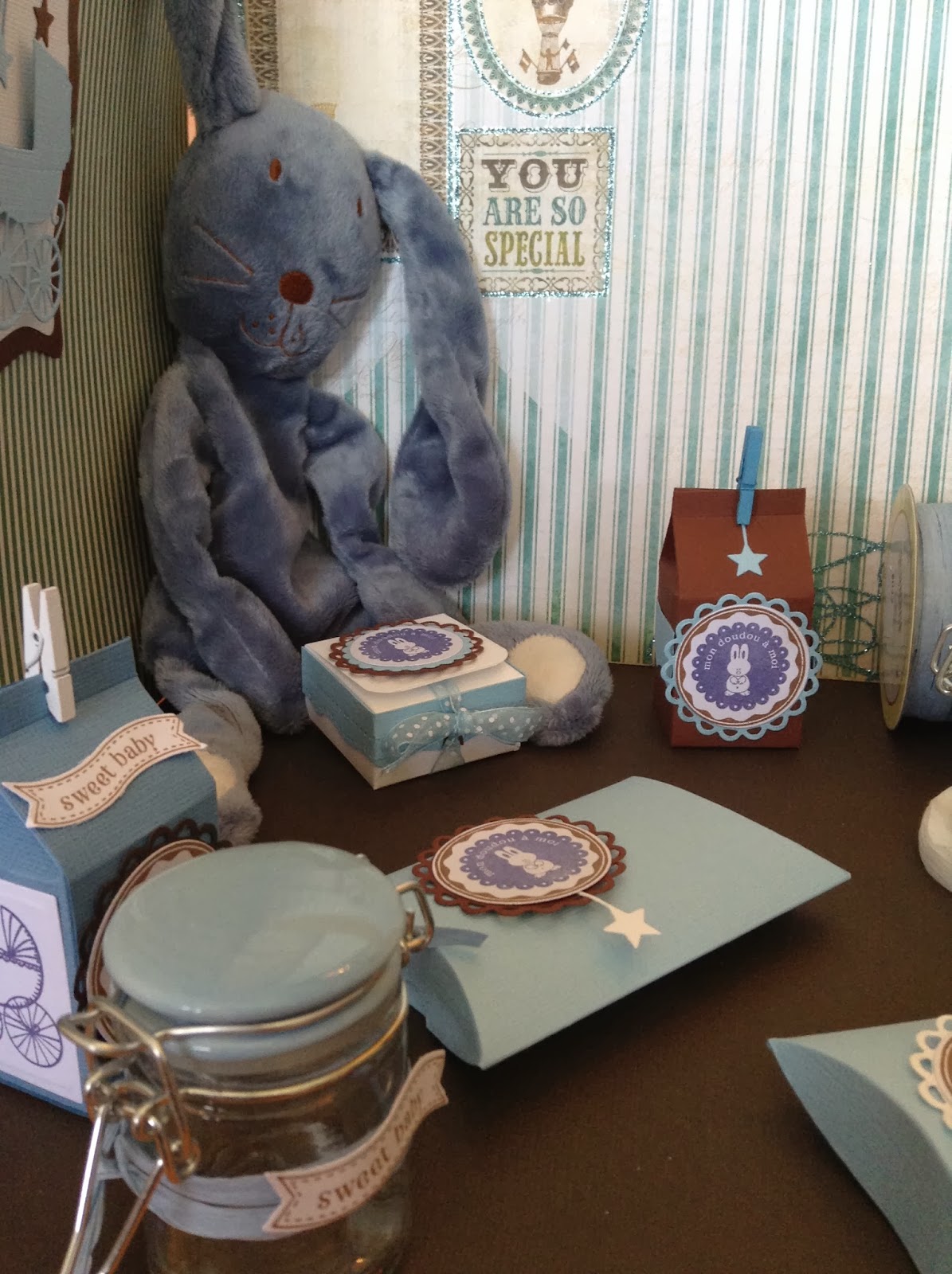 Je vous présente aujourd'hui des petites boîtes sur le thème des doudous. J'ai décidé de mettre en scène l'indispensable peluche pour les tous petits. Ici, c'est Monsieur Lapin Bleu tout doux et absolument craquant.